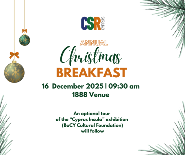 Σας περιμένουμε στο καθιερωμένο χριστουγεννιάτικο πρωινό του CSR Cyprus την Τρίτη, 16 Δεκεμβρίου 2025, στις 09:30 π.μ., στο 1888 Venue (Λευκώνος 23, 1011 παλιά Λευκωσία). Ελάτε να αποχαιρετήσουμε το 2025 με καφέ, εκλεκτά εδέσματα και καλή παρέα! Μετά το πρωινό, γύρω στις 11:45 π.μ., όσες/οι επιθυμο...