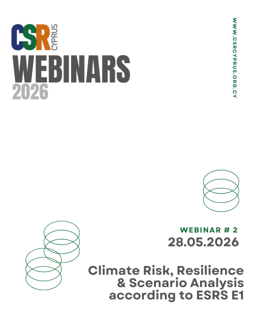 Το CSR Cyprus διοργανώνει δεύτερο διαδικτυακό σεμινάριο (webinar) για το 2026, αποκλειστικά για τα Μέλη του, με θέμα « Ανάλυση Κινδύνων, Ανθεκτικότητας και Σεναρίων σύμφωνα με το ESRS E1». Η συμμετοχή είναι χωρίς κόστος. Hμερομηνία: 28 Μαΐου 2026 | 10:00-11:00 π.μ. Eισηγήτρια: Δρ Ευαγγελία Λουρ...